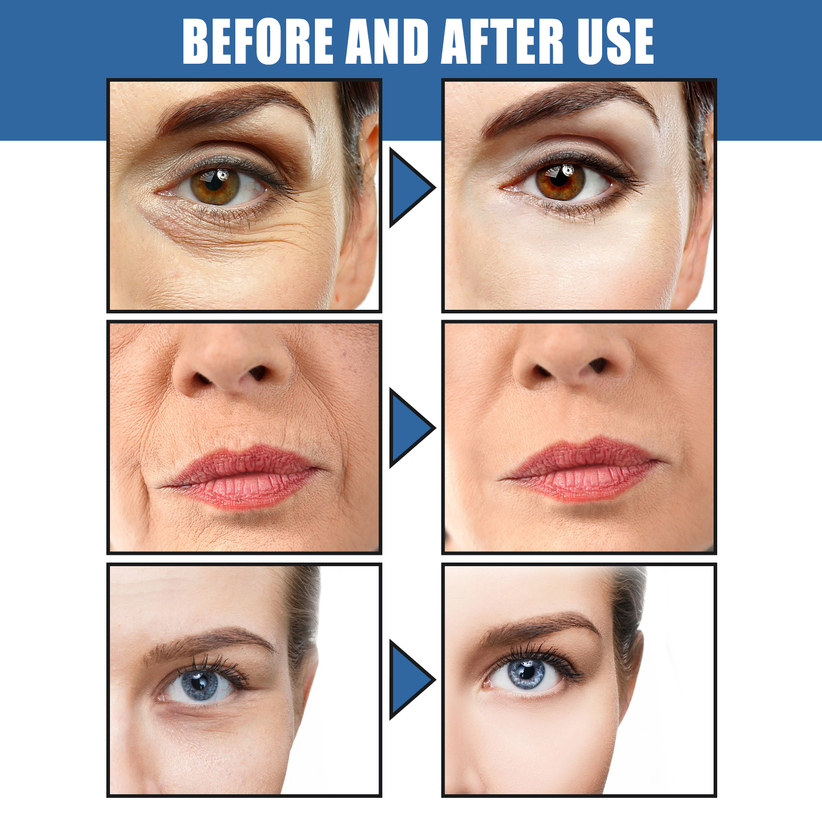 Our 5-second retinol anti-wrinkle cream contains mineral oil, glycerin stearate, carbomer. It can temporarily reduce wrinkles and eye puffiness in as little as 5 seconds, provide a firming effect, and instantly lift the skin, brighten and strengthen the skin, making the skin look younger. Its application is simple: clean the skin with warm water. Apply an appropriate amount of anti-wrinkle cream to the target area. Dab and make sure to leave about 1mm of cream in the target area. Restores the skin evenly bright, moistens without greasy, absorbs quickly, says goodbye to wrinkles.