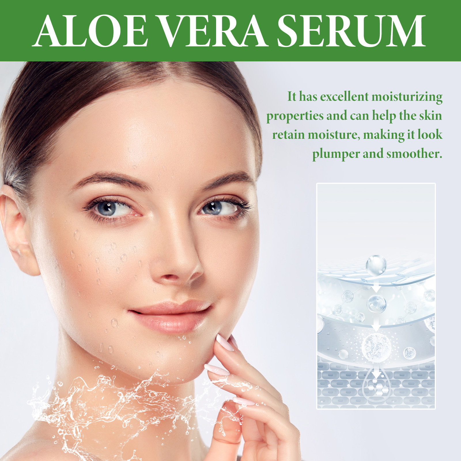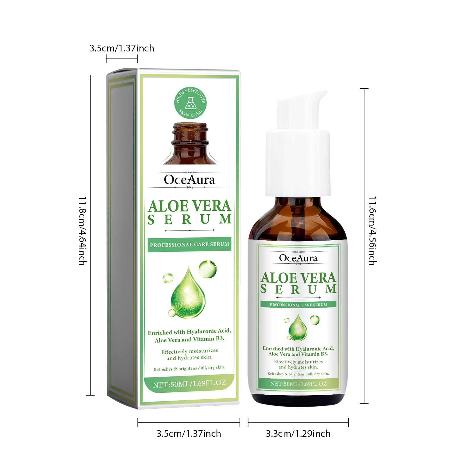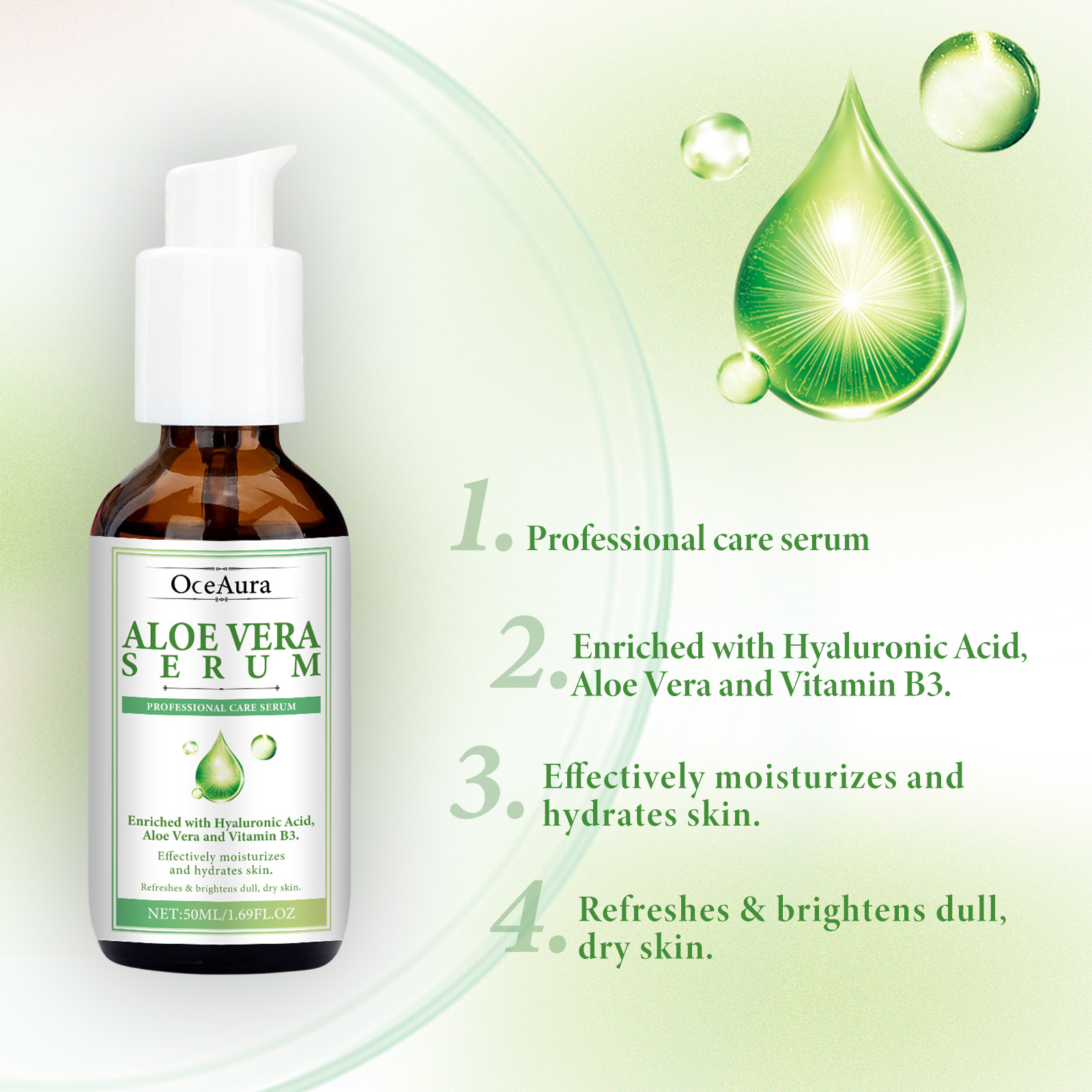 Our Aloe Vera Serum contains Niacinamide, Hyaluronic Acid, Aloe Vera Leaf Extract. It improves the overall texture of the skin, making it look brighter and more even, helps the skin retain moisture, and makes the skin look fuller and smoother. Its use method is very simple: after cleansing and toning, take appropriate amount of essence evenly apply to the face skin, gently massage with the hand to absorb. It fights the signs of skin aging, reduces the appearance of fine lines and wrinkles, deeply moisturizes the skin, reduces dryness and roughness, and keeps the skin hydrated.