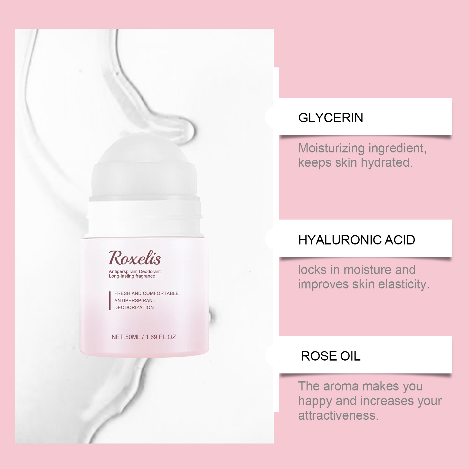 Our roll-on fragrances contain glycerin, hyaluronic acid and mint leaf extract. It can moisturize ingredients and keep skin hydrated. Lock in moisture, improve skin elasticity; Aroma makes you happy and increases your attractiveness. Its application method is simple: 1. Thoroughly clean and dry the underarm skin; 2. Let the ball roll so that the product is evenly applied to the armpit skin. 3. Gently massage until fully absorbed. Light texture, cool to the touch; Eliminate odors and increase personal charm.