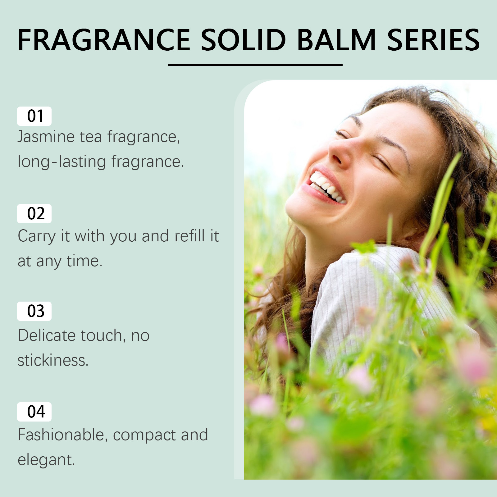 Our fragrant solid balm contains bergamot extract, magnolia extract and white cedar extract. It moisturizes and locks in water, leaving skin soft and smooth. Antioxidant, soothing skin. Soothe the nerves and exude a charming aroma. Its use method is very simple: open the lid of the balm box, take a proper amount of balm and apply it to the inside of the wrist, the back of the neck or behind the ears and other obvious parts of the pulse. Gently massage the area with your fingertips to cover it evenly. The delicate blend of jasmine and green tea exudes natural vitality. Adding lemon extract can boost your spirits and make you feel refreshed.