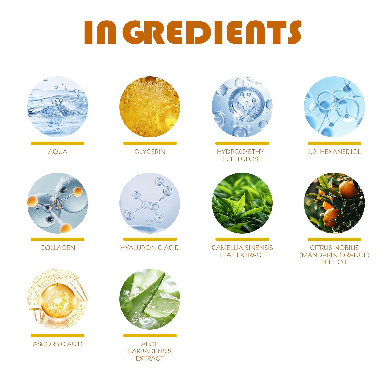 Our collagen anti-wrinkle serum contains glycerin, hydroxyethyl cellulose, 1, 2-hexadiol. It can lift and tighten loose skin, restoring elasticity and a youthful smooth texture. The way to use it is simple: shake the bottle for about 10 seconds before use. Put two or three drops on your palm and rub them together with your fingers. Apply the essential oil to your face, starting with your forehead and moving towards your cheeks and chin. Then wipe your face with your hands to allow the excess oil to absorb into your skin. It can also reduce the appearance of fine lines and wrinkles.