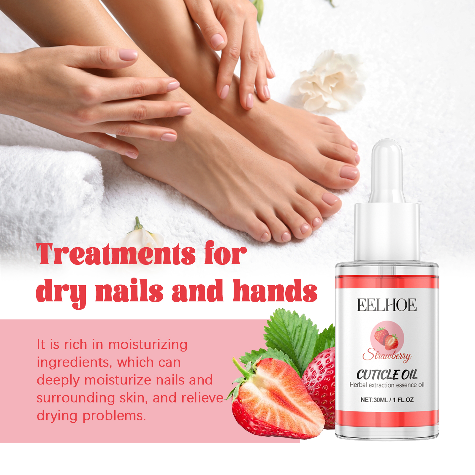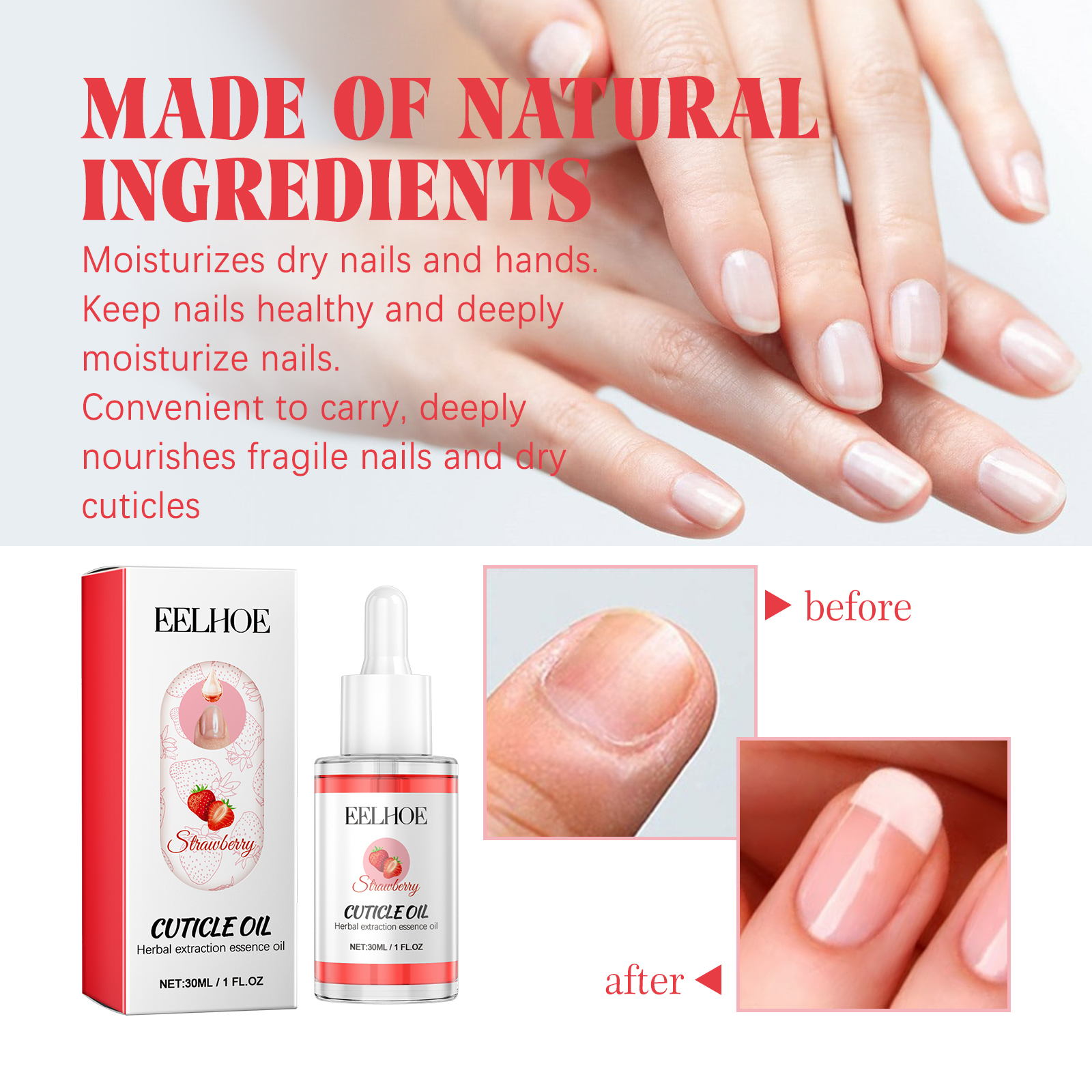 Our Cuticle Oil contains Fragaria Chiloensis (Strawberry)Fruit Extract, Simmondsia Chinensis(Jojoba) Seed Oil, Camellia Sinensis Seed Oil. It moisturizes dry nails and hands to keep them healthy, nourishes fragile nails and dry cuticles, and enhances the appearance of nails, making them more beautiful and shiny. Its application is simple: Clean your nails with a wet towel, apply this product to your nails and the skin around your nails, and gently massage the nail bed to help absorb. It can deeply moisturize nails and surrounding skin and relieve dryness.