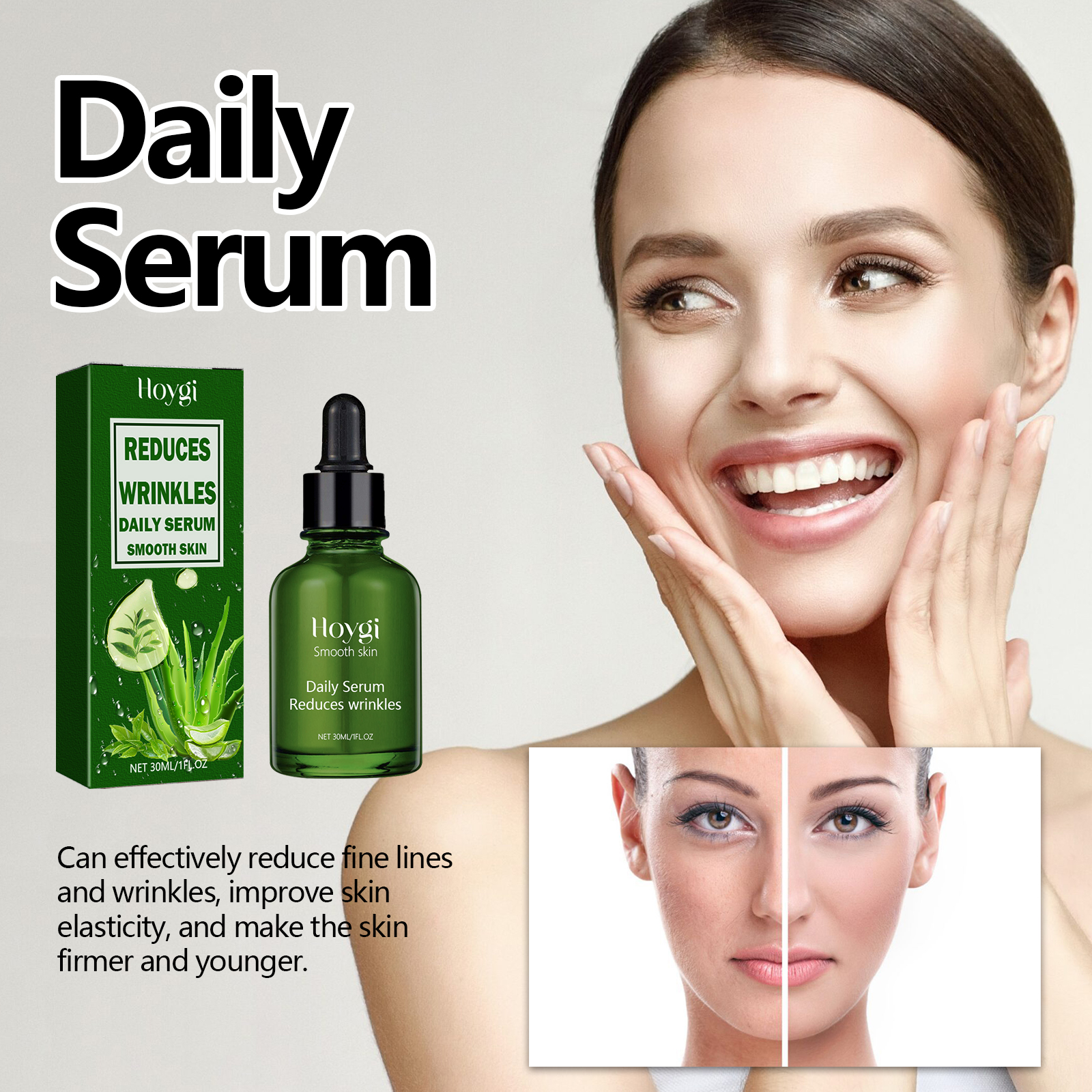 Our Daily Serum contains Glycerin, Ascorbic Acid, Hyaluronic Acid. It can improve dryness and roughness and provide long-lasting moisturizing effect to the skin, which can effectively reduce fine lines and wrinkles, improve skin elasticity, and make skin firmer and younger. Its application method is very simple: use a dropper to take an appropriate amount of essence evenly drop on the face skin, gently massage until completely absorbed. Effectively fade the fine lines on the face, make the skin more delicate and smooth, the texture is fresh and not greasy, easy to be absorbed by the skin.