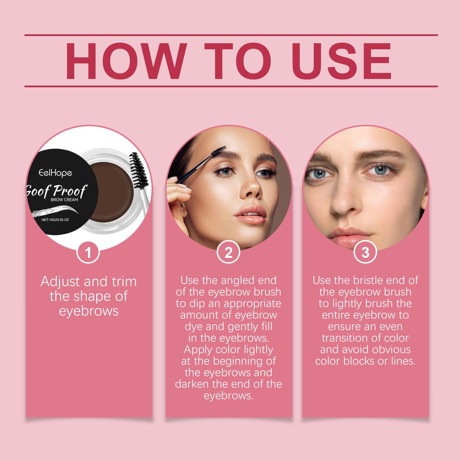 Our eyebrow cream contains glycerin, sodium hyaluronate and iron oxide. It can moisturize for a long time and ensure the comfort of eyebrows after dyeing; Uniform color, lasting color. Keep your eyebrows healthy. Its use method is very simple: 1. Adjust and trim the shape of eyebrows; 2. Dip the slanted end of the eyebrow brush into just enough eyeshadow to gently fill in your eyebrows. Apply a light color at the beginning of your eyebrows and a darker color at the end. 3. Use the tip of the eyebrow brush to gently brush all over your brow, ensuring an even transition of color and avoiding obvious patches or lines. Quickly shape smooth eyebrows and enhance facial contours. Apply it all at once to keep your eyebrows perfect throughout the day.