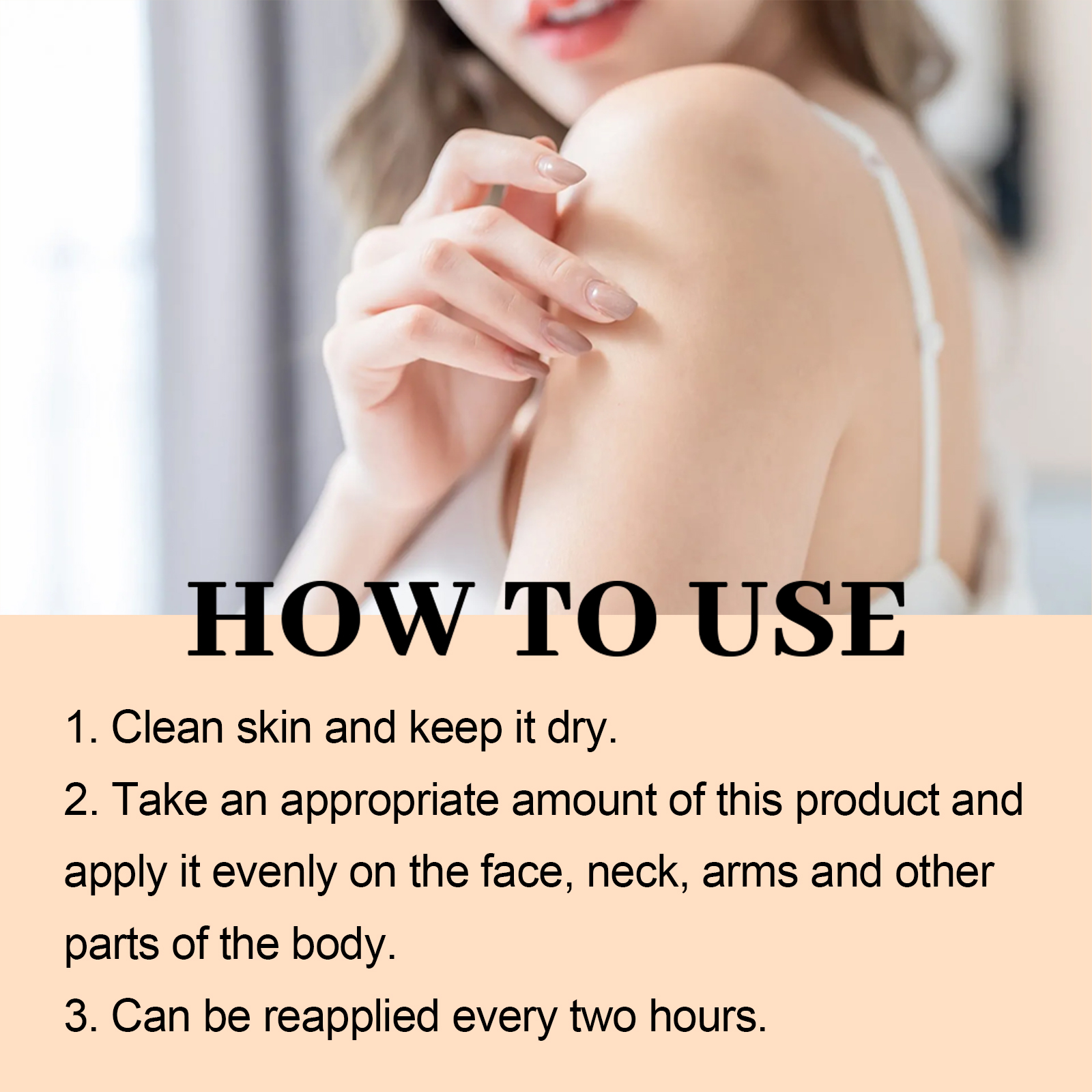 Our facial sunscreens contain ethyl hexyl methoxycinnamate and isononyl isononate. It can effectively block UVA and UVB UV rays, prevent sunburn and tanning, and protect the skin. Its use method is very simple: clean the skin and keep dry, take appropriate amount of this product evenly spread on the face, neck, arms and other body parts, can be reapplied every two hours. And can effectively block UV rays.