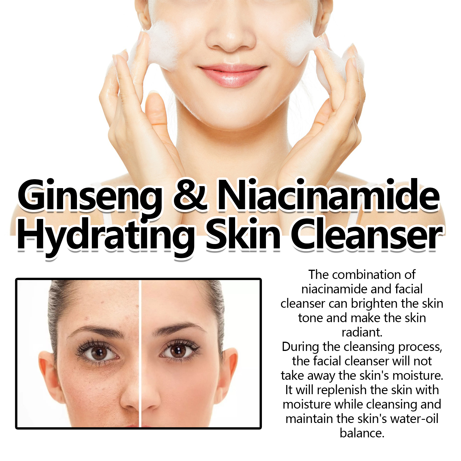 Our ginseng cleanser contains glycerin, ginseng extract, and niacinamide. It can clean facial oil, dust, etc., and bring fresh skin. Rich in ginseng extract, can reduce skin irritation, suitable for all skin types. This product is easy to foam, delicate and rich foam, easy to wash, bring you a comfortable experience; The combination of niacinamide and cleanser can lighten the complexion and make the skin glow. Its use method is very simple: 1. First wet the face with warm water, take an appropriate amount of facial cleanser on the palm, rub into a foam, and then apply to the face; 2. Gently massage your face with your fingertips to help clear your skin; 3. Finally, wash your face with clean water. During the cleansing process, the cleanser does not remove moisture from the skin. Ginseng cleanser not only cleans skin, but also replenishes skin moisture and keeps skin water-oil balance. It can also clean facial oil, dust, etc., and bring freshness to the skin; Rich in ginseng extract, can reduce skin irritation, suitable for all skin types.