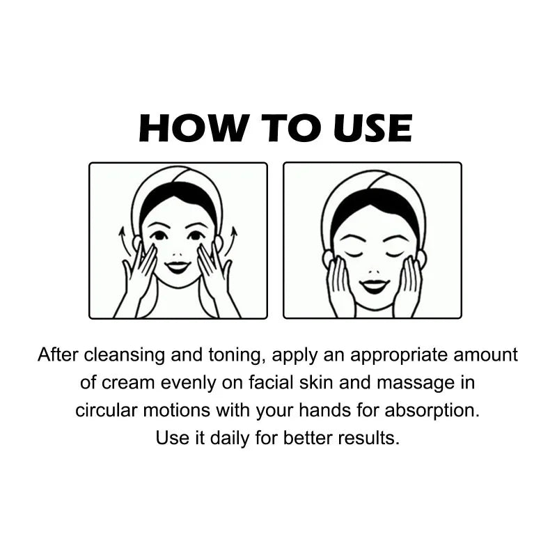 After cleansing and toning, apply an appropriate amount of cream evenly on facial skin and massage in circular motions with your hands for absorption.Use it daily for better results.