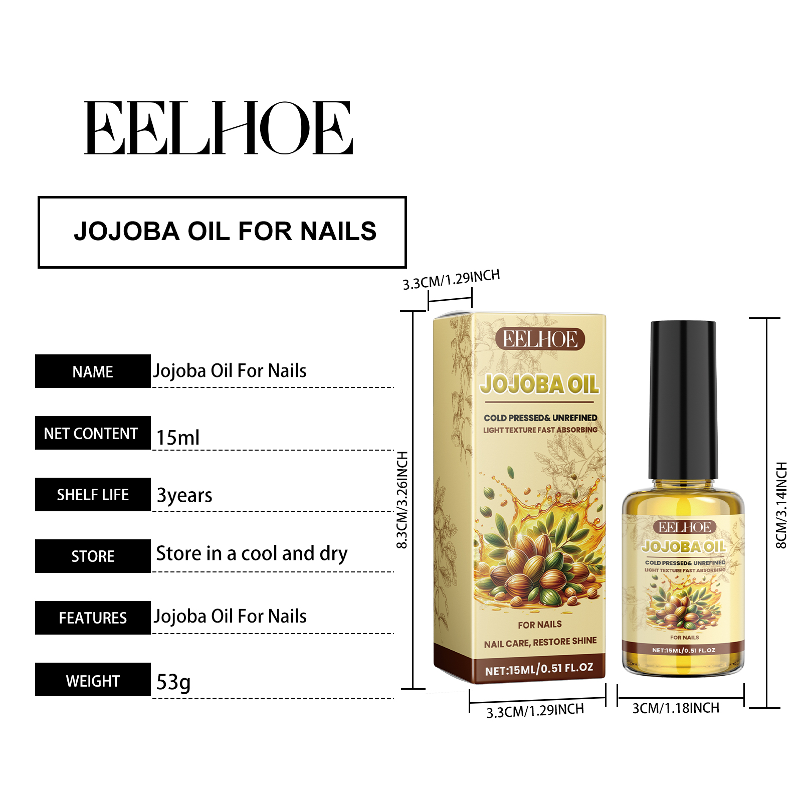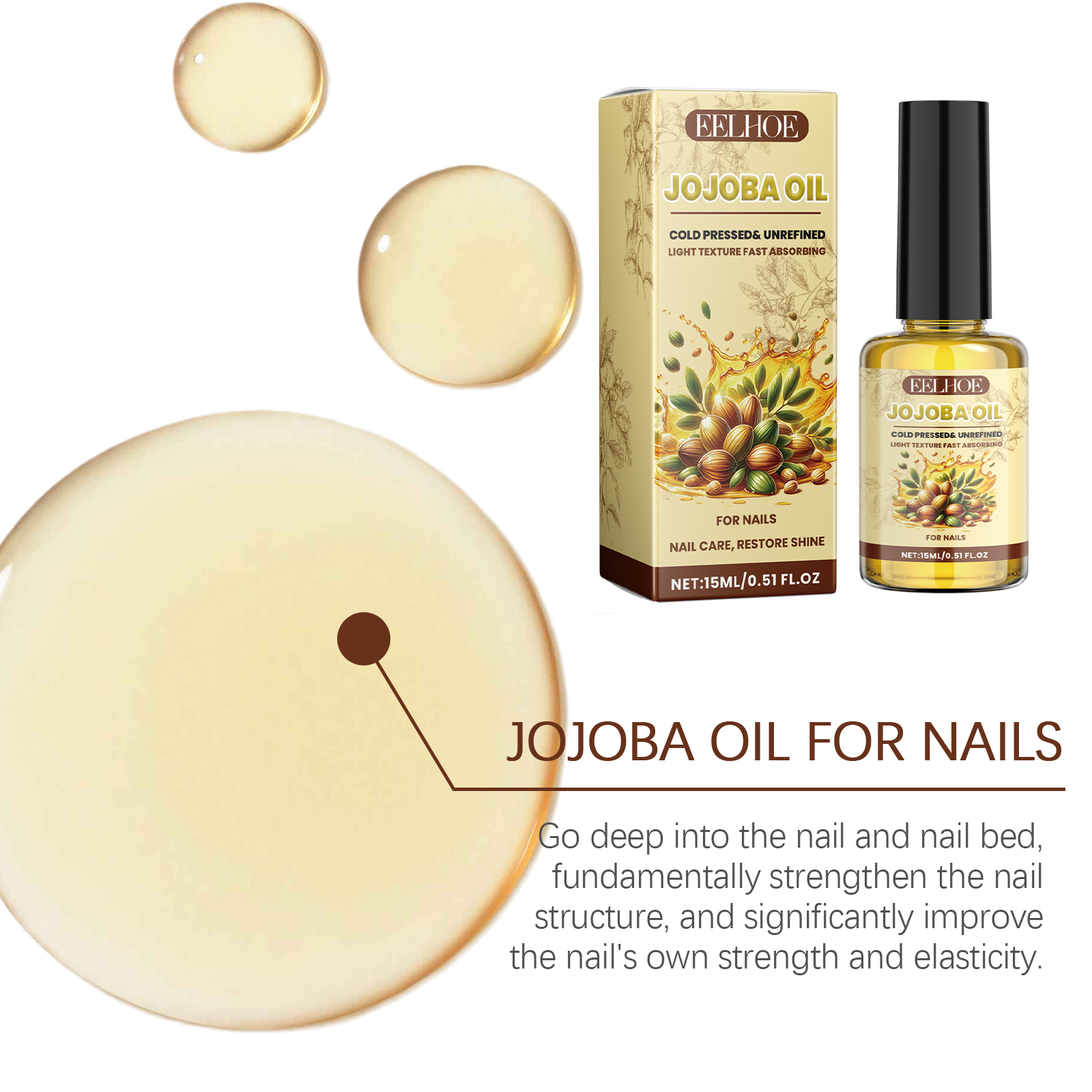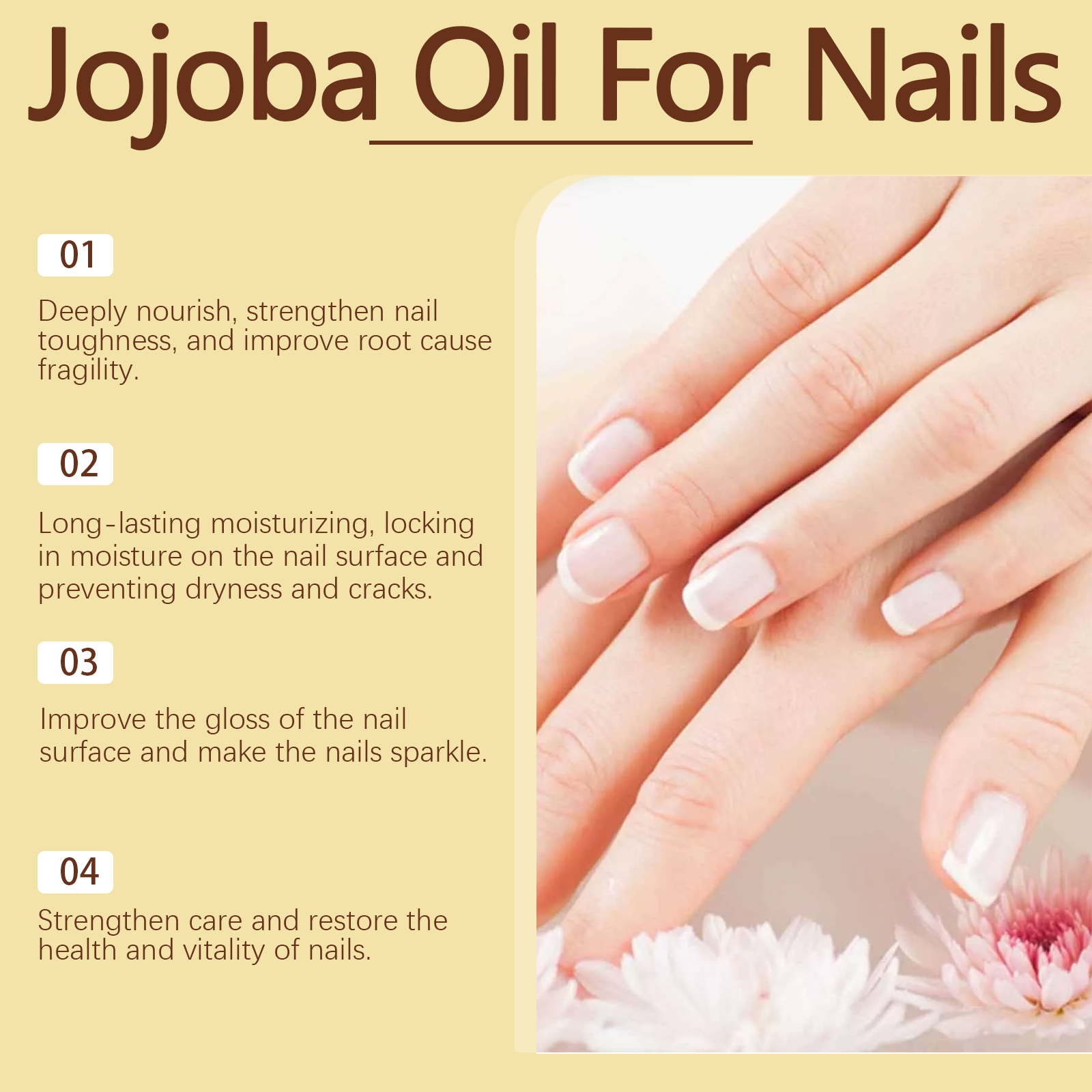 Our Jojoba Oil For Nails contains Simmondsia Chinensis(Jojoba) Seed Oil, Ascorbic Acid, Tocopherol. It can deeply nourish, strengthen nail toughness, improve nail fragility, lasting moisture, lock in moisture on the nail surface to prevent dryness and cracks, enhance care, and restore nail health and vitality. Its use method is very simple: clean and dry the nails and the surrounding skin, take a proper amount of nail polish, evenly apply on the nails, gently massage with the fingertips to absorb. It can improve the gloss of the nail surface, make the nails shine, target the root causes of brittle, dry, shiny nails, and strive to provide the strengthening and deep moisturizing care that nails really need.