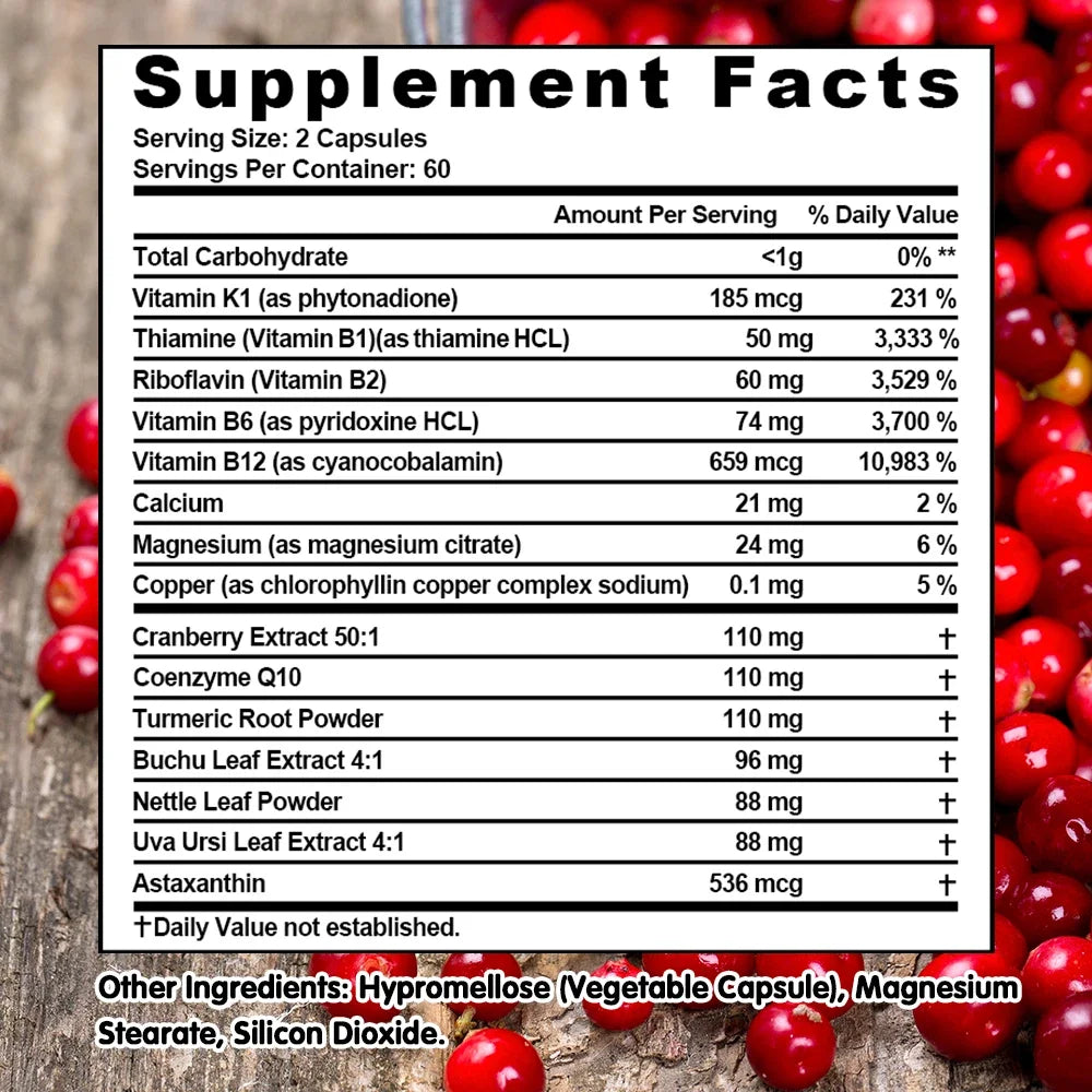 Maximum Strength: Cranberry Capsules 30000 mg with additional herbs in each capsule. Cranberry is a well-known rich and healthy fruit, made naturally, containing polyphenols and other natural antioxidants. Cranberry is rich in vitamin C, has detoxifying properties, helps keep pH levels within the normal range, supports urinary tract health and bladder support; no side effects.