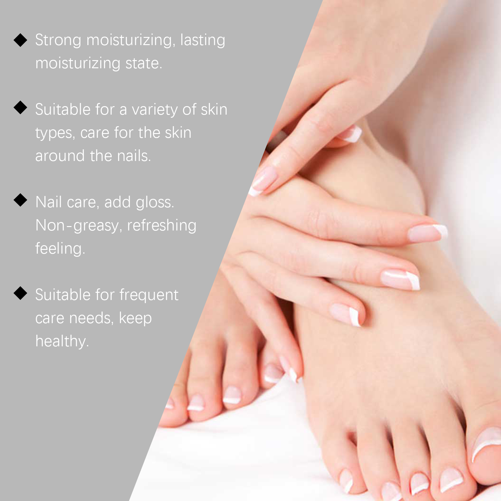 Our nail exfoliating skin treatment essence contains glycerin and mineral oil. It can be absorbed immediately after application: gives a long-lasting moisturizing effect, leaving nails moisturized and shiny. Removes dead skin to smooth the skin around the edge of the finger without damaging the skin. Its use method is very simple: clean the nails and keep dry, take appropriate amount of this product evenly applied to the nail surface and the skin around the nails. Massage gently until absorbed. And can be lightweight and no burden, bring comfortable use experience.