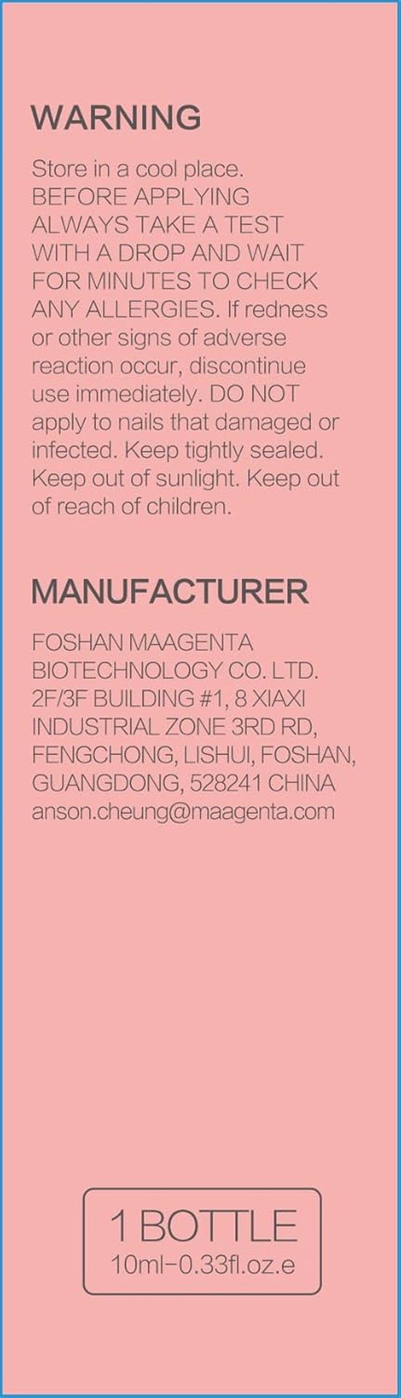 1. May cause ALLERGIC REACTION. Please take SKIN TEST every time before doing manicure. Discontinue using immediately once feeling uncomfortable.