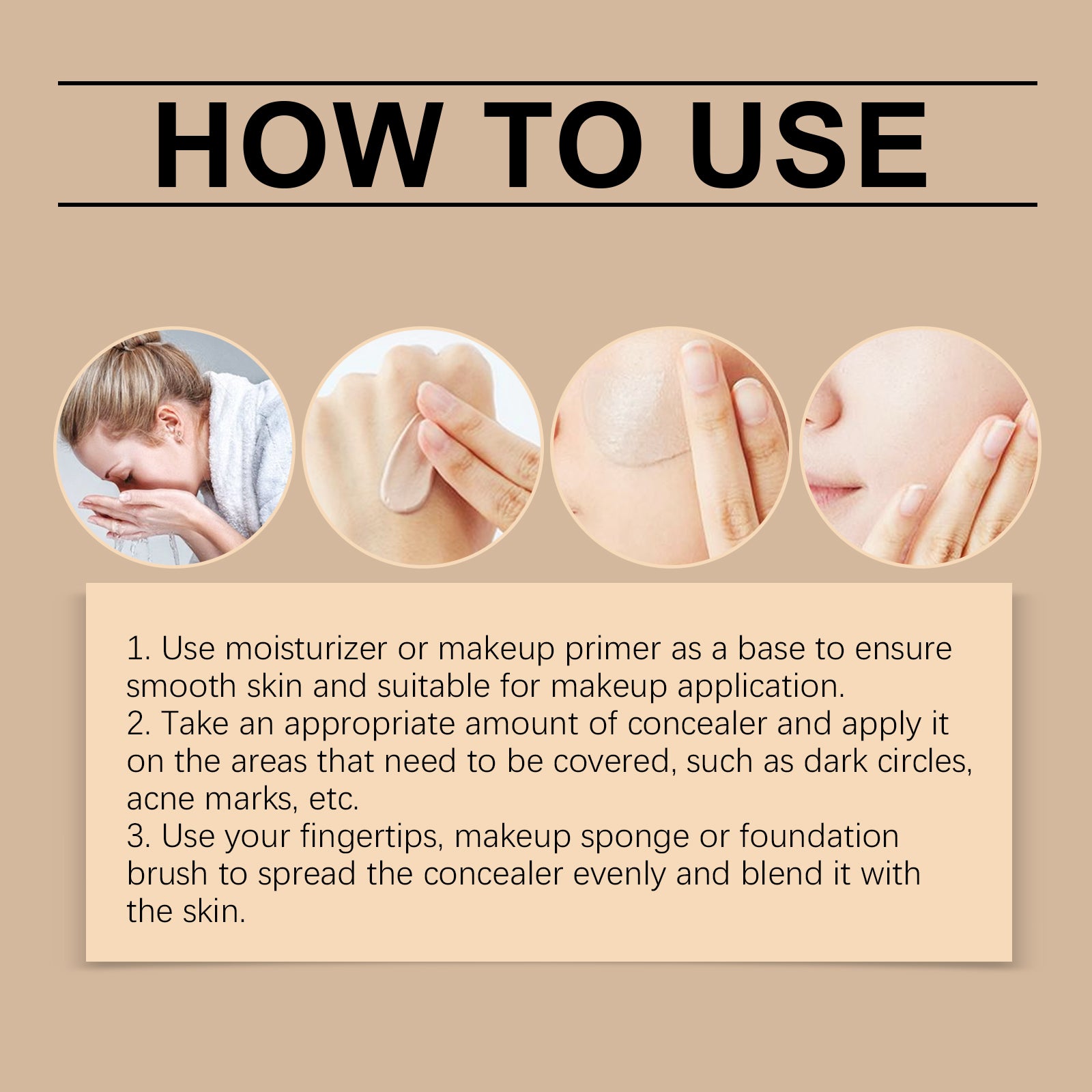 Our small gold tube foundation concealer contains sodium hyaluronate and iron oxide. It can improve the elasticity of the skin, resulting in a better complexion. Its use method is very simple: 1. Use moisturizer or makeup primer as the base color to ensure smooth skin and suitable for makeup applications. 2. Take a proper amount of concealer and apply it to the parts that need to be covered, such as dark circles, acne marks, etc. 3. Use your fingertips, makeup sponge or foundation brush to evenly apply concealer and blend it into your skin. And it works with all skin tones.