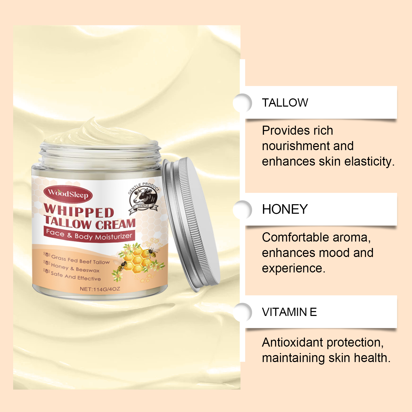 Our tallow Skin Honey cream contains tallow, honey and beeswax. It can provide rich nutrition, enhance skin elasticity; A pleasant aroma that enhances mood and experience. Antioxidant protection to keep skin healthy. Its application method is very simple: 1. Clean the face and body skin, keep dry; 2. Apply appropriate amount of the product evenly on the face and whole body skin; 3. Gently massage until completely absorbed. Moisturize continuously, leaving skin smooth and delicate. Contains honey ingredients to enhance the use experience.