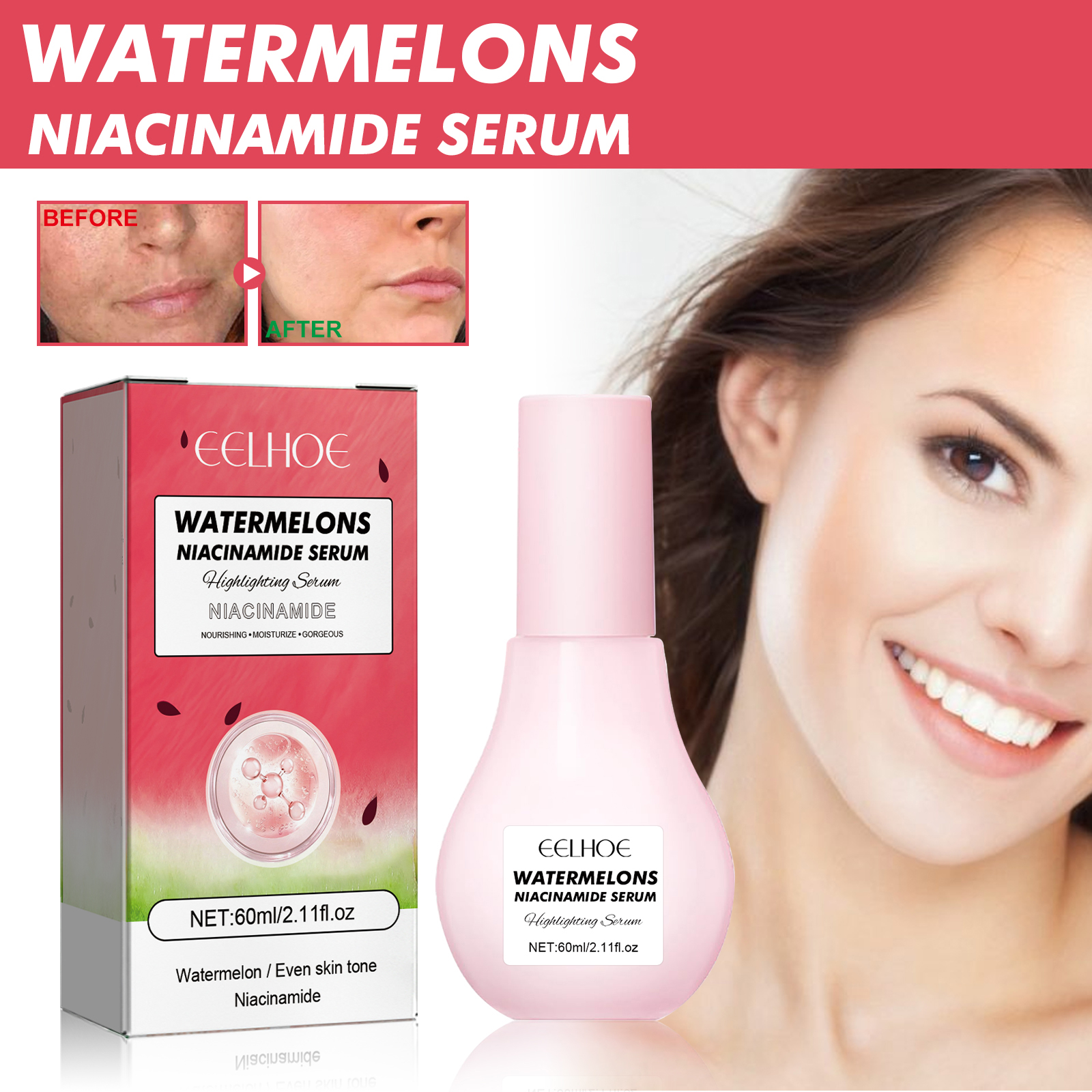 Our Watermelons Niacinamide Serum contains nicotinamide, sodium hyaluronate, nitrite. It can help to even skin tone, reduce enlarged pores, lighten skin tone, moisturize face, reduce dark spots and dull, help skin timely replenish and lock water, increase skin water content, and make skin glow. Its use method is very simple: after cleansing and toning, take 1-2 pumps of essence evenly apply on the face skin and gently massage in circles with your hand until absorbed, or mix the essence with daily skin care product foundation and use once in the morning and once in the evening for better effect. Helps balance skin tone, reduces the appearance of pores, and locks in moisture.